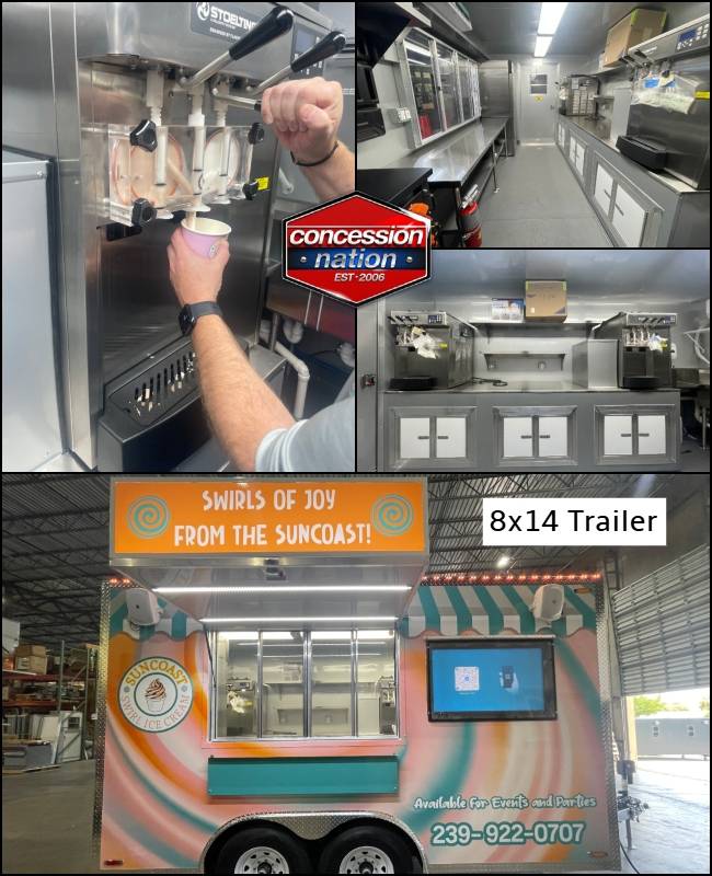 8×14 concession trailers for sale. This 8×14 Concession Trailer was built for Sun Coast Swirl, in Naples, Florida in 2025. This charming ice cream trailer is fully loaded and a money-spinner indeed. For cooling equipment this trailer features two top of the line soft serve machines. It also has a full size refrigerator.