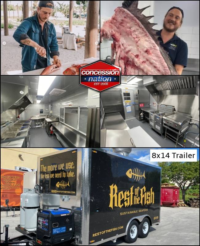 8×14 concession trailers for sale. This 8×14 Concession Trailer was built for Reed The Fishmonger, in South Palm Beach, Florida in 2025. This great looking seafood trailer is fully loaded. This trailer is equipped with a complete cooking line including a wide panel griddle and two deep fryers. For cooling equipment it has a sandwich prep station and a full size single door freezer and refrigerator.
