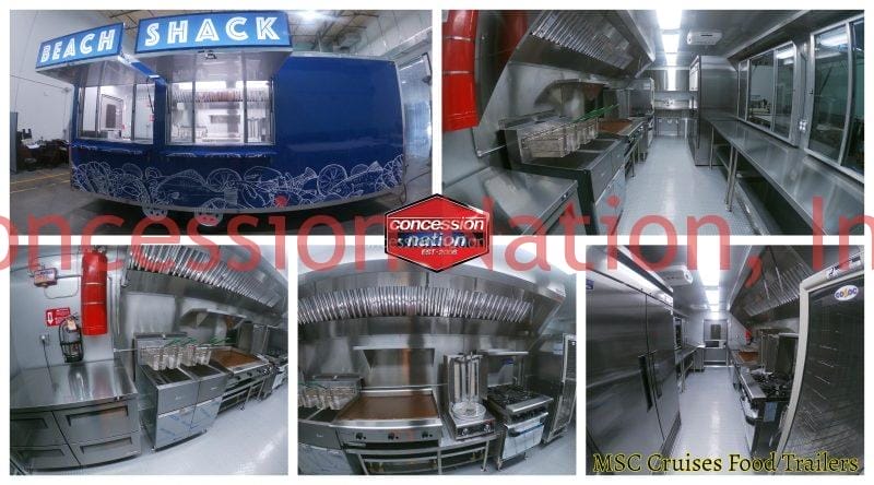 This is one of six 8×20 Concession Trailers For Sale built for MSC Cruises in Bahamas. This attractive concession trailer is fully loaded and a money maker indeed. It has an 11 ft hood with fire suppression system for its 4 burners range with oven, gyro machine, 36″ griddle, and two deep fryers. It includes a heater/proofer cabinet. Its cooling equipment features a refrigerator, under counter freezer and sandwich prep.
