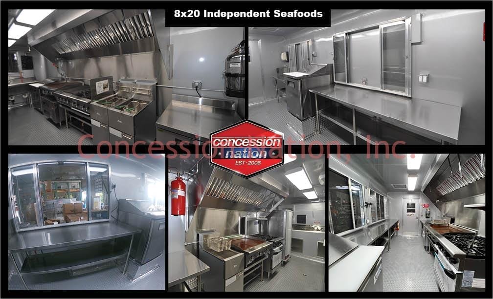 This 8×20 Concession Trailer For Sale was built for Independent Seafoods, in Florida. This charming concession trailer is fully loaded and a money machine indeed. It has an 11 ft hood with fire suppression system for its 4 burners range with oven, 24″ broiler, 36″ griddle, and two deep fryers. Its cooling equipment features a refrigerator and two sandwich preps.